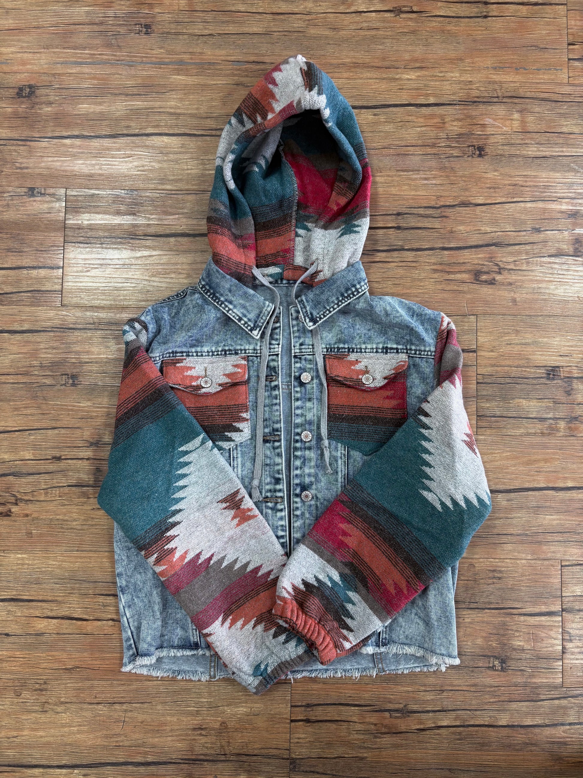 Multicolor Print Frayed Hem Denim Jacket